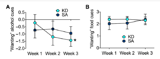 為了驗證上述想法,研究團(tuán)隊讓23名剛?cè)朐航邮苤委煹男锞普哌M(jìn)行生酮飲食,并將另外23名酗酒者作為對照組。為了評估生酮飲食對他們的影響,研究人員每周測量一次參與者的酮體和乙酸鹽水平。