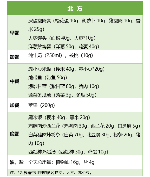 以下食譜適合8歲學(xué)齡兒童,提供的能量在1470~1610范圍內(nèi),蛋白質(zhì)57~73g,脂肪占總能量比為23%~30%。其他年齡段兒童青少年需根據(jù)不同年齡段各類食物建議攝入量進(jìn)行適當(dāng)調(diào)整。更多食譜示例見(jiàn)《指南》。