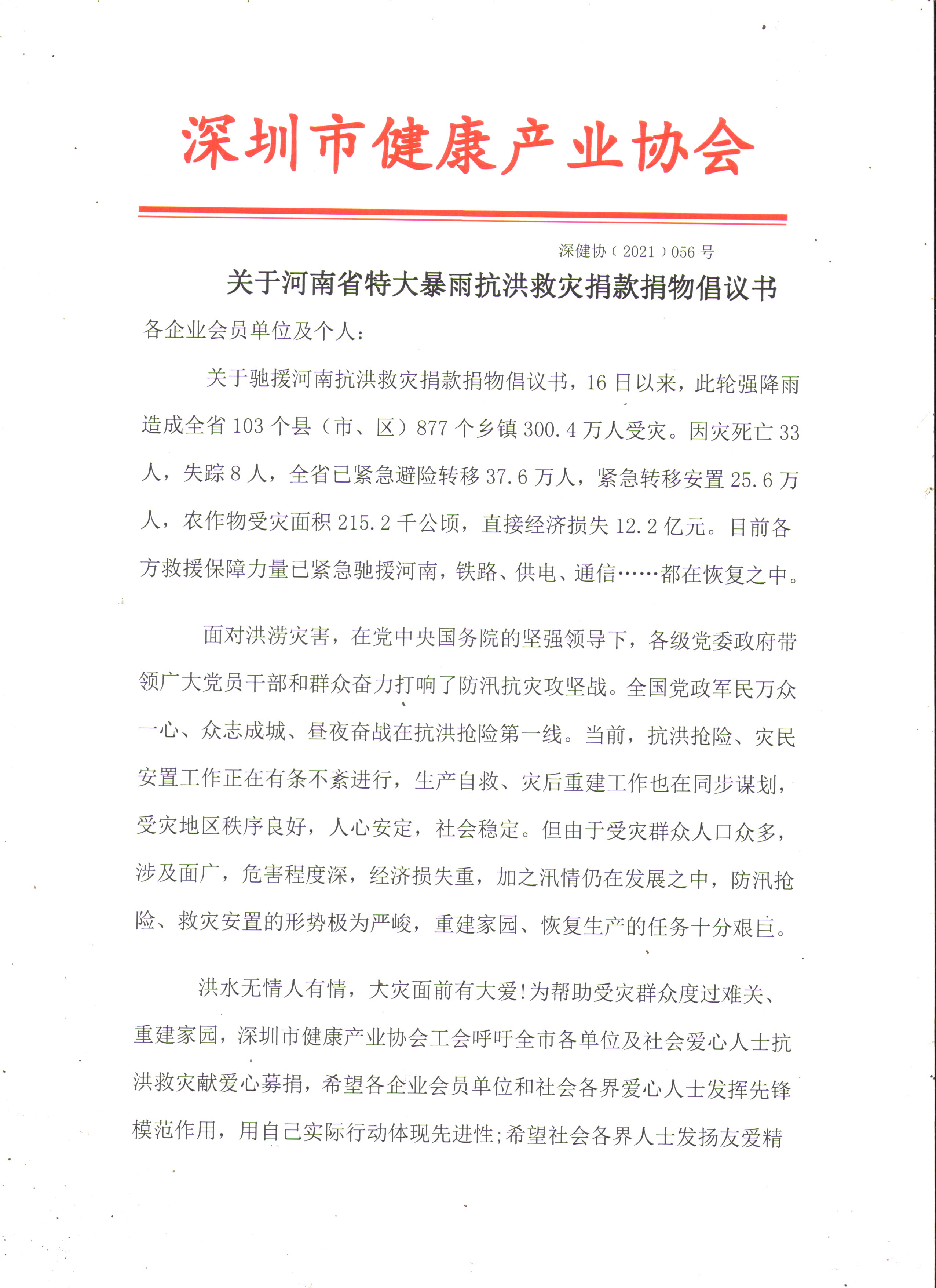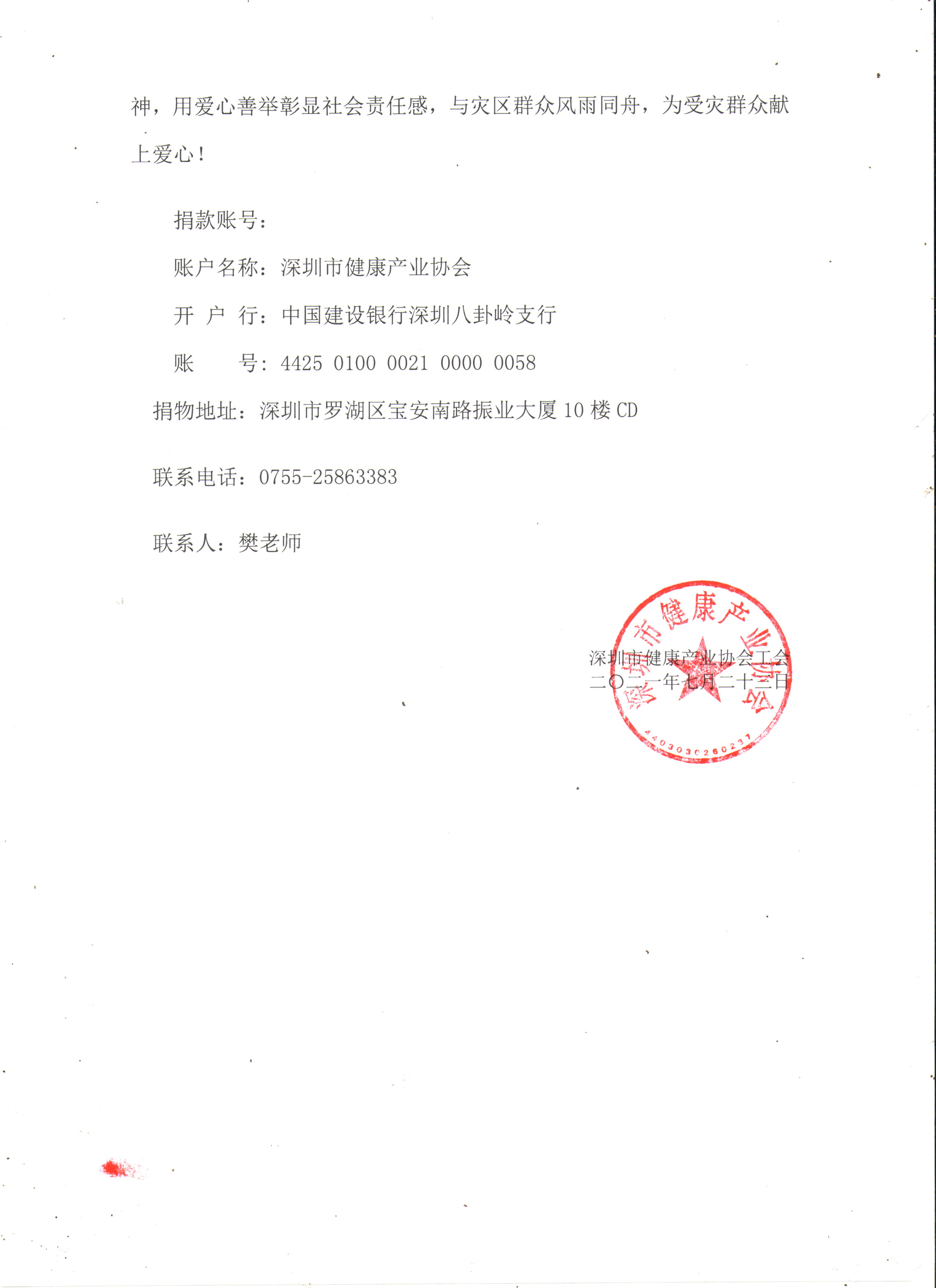 洪水無(wú)情人有情,大災(zāi)面前有大愛!為幫助受災(zāi)群眾度過難關(guān)、重建家園,深圳市健康產(chǎn)業(yè)協(xié)會(huì)工會(huì)呼吁全市各單位及社會(huì)愛心人士抗洪救災(zāi)獻(xiàn)愛心募捐,希望各企業(yè)會(huì)員單位和社會(huì)各界愛心人士發(fā)揮先鋒模范作用,用自己實(shí)際行動(dòng)體現(xiàn)先進(jìn)性;希望社會(huì)各界人士發(fā)揚(yáng)友愛精神,用愛心善舉彰顯社會(huì)責(zé)任感,與災(zāi)區(qū)群眾風(fēng)雨同舟,為受災(zāi)群眾獻(xiàn)上愛心!