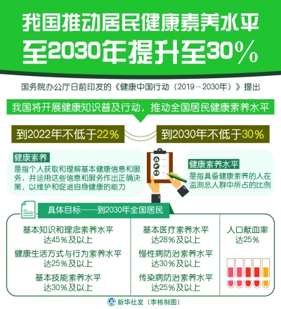 要想養(yǎng)成健康的生活方式,提高個(gè)人的健康素養(yǎng)必不可少。健康素養(yǎng)是指?jìng)€(gè)人獲取和理解基本健康信息和服務(wù),并運(yùn)用這些信息和服務(wù)作出正確決策,以維護(hù)和促進(jìn)自身健康的能力。《意見(jiàn)》明確指出,到2022年和2030年,全國(guó)居民健康素養(yǎng)水平分別不低于22%和30%。“簡(jiǎn)單來(lái)說(shuō),也就是具備健康素養(yǎng)的人在監(jiān)測(cè)總?cè)巳褐兴嫉谋壤簧儆?2%和30%。而當(dāng)前的居民健康素養(yǎng)水平是14.18%,距離目標(biāo)還有較大距離。”國(guó)家衛(wèi)健委宣傳司司長(zhǎng)宋樹(shù)立告訴記者,《意見(jiàn)》將“健康知識(shí)普及行動(dòng)”作為15項(xiàng)專項(xiàng)行動(dòng)中的第一項(xiàng),明確了提升健康素養(yǎng)是增進(jìn)全民健康的前提,要讓健康知識(shí)行為和技能成為全民普遍具備的素質(zhì)和能力。